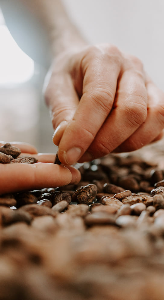 Ici, chaque création commence par une fève de cacao brute, rigoureusement sélectionnée pour sa qualité, sa provenance et son histoire.