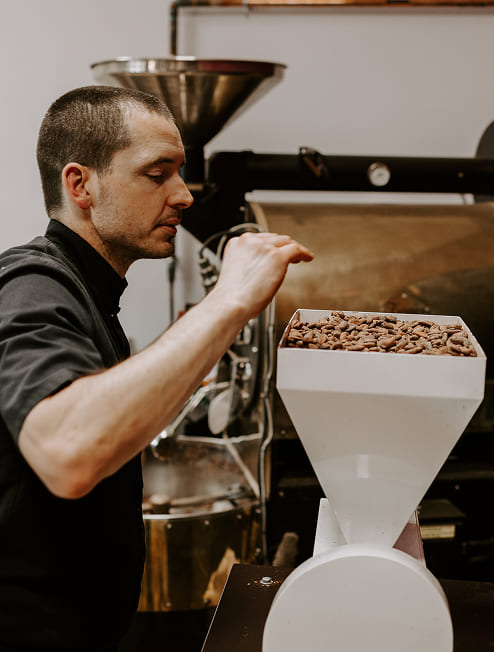 c’est dans notre atelier que la matière prend vie : nous sélectionnons les fèves, nous les torréfions, nous les broyons et nous les affinons durant une centaine d’heures sur meule de pierre.