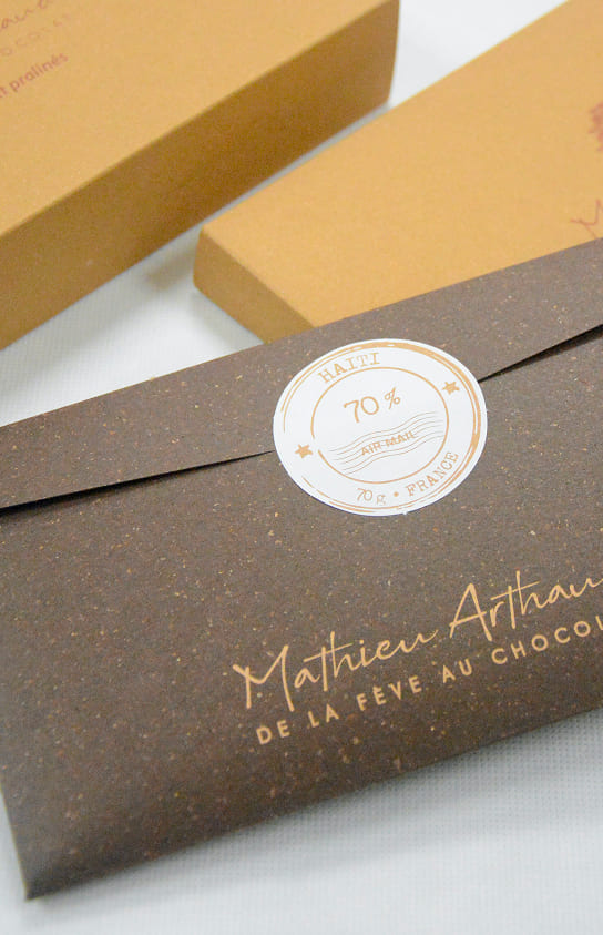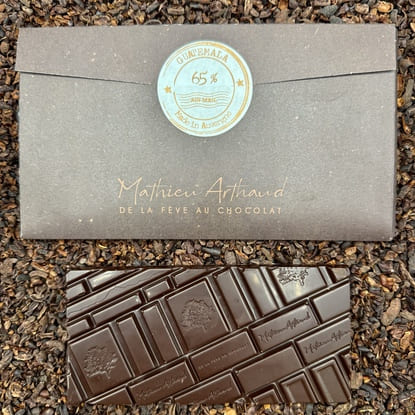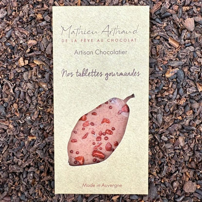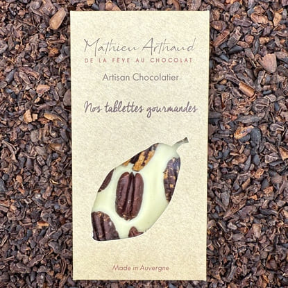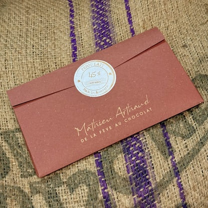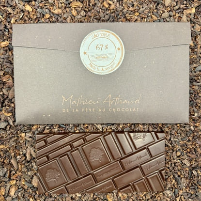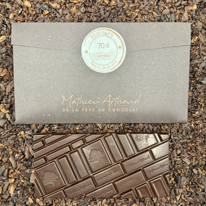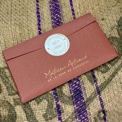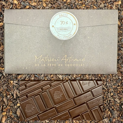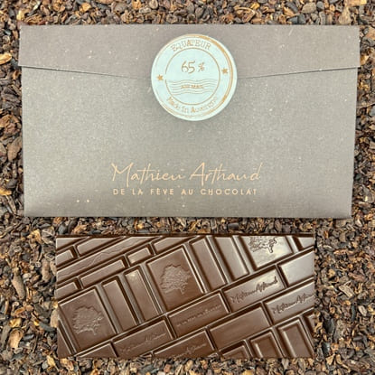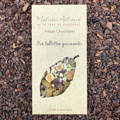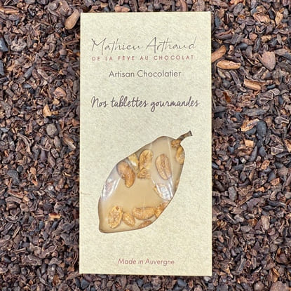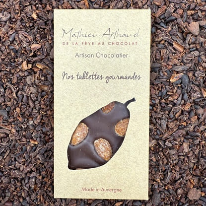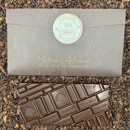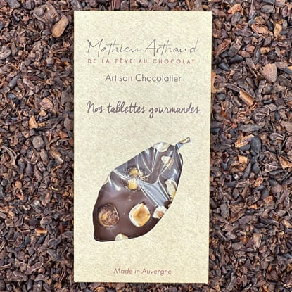 Les tablettes de chocolat signées Mathieu Arthaud Chocolatier sont fabriquées à la main dans notre atelier de Cournon-d’Auvergne selon la méthode artisanale bean-to-bar. Chaque tablette est produite à partir de fèves brutes soigneusement sélectionnées pour leur origine et leur qualité, puis transformées sur place.